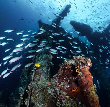 La mayoría de los sitios de buceo tienen arrecifes de coral llenos de vida. Por ejemplo, verás corales rojos, amarillos y azules. Los peces nadan entre el arrecife como si vivieran en una ciudad submarina. Además, algunos arrecifes se extienden muy profundo.